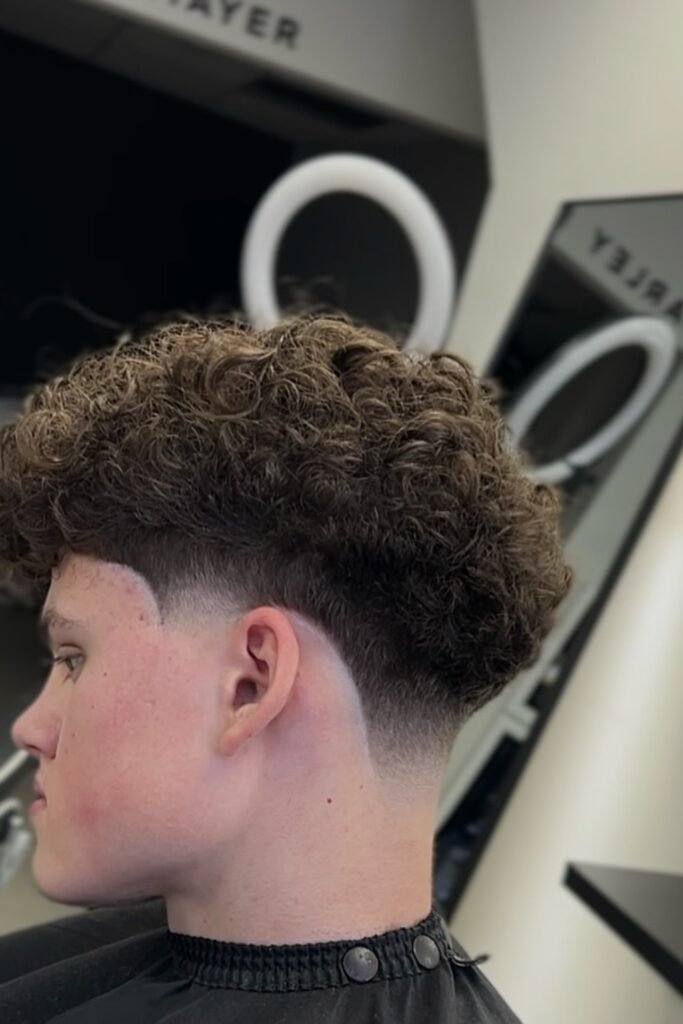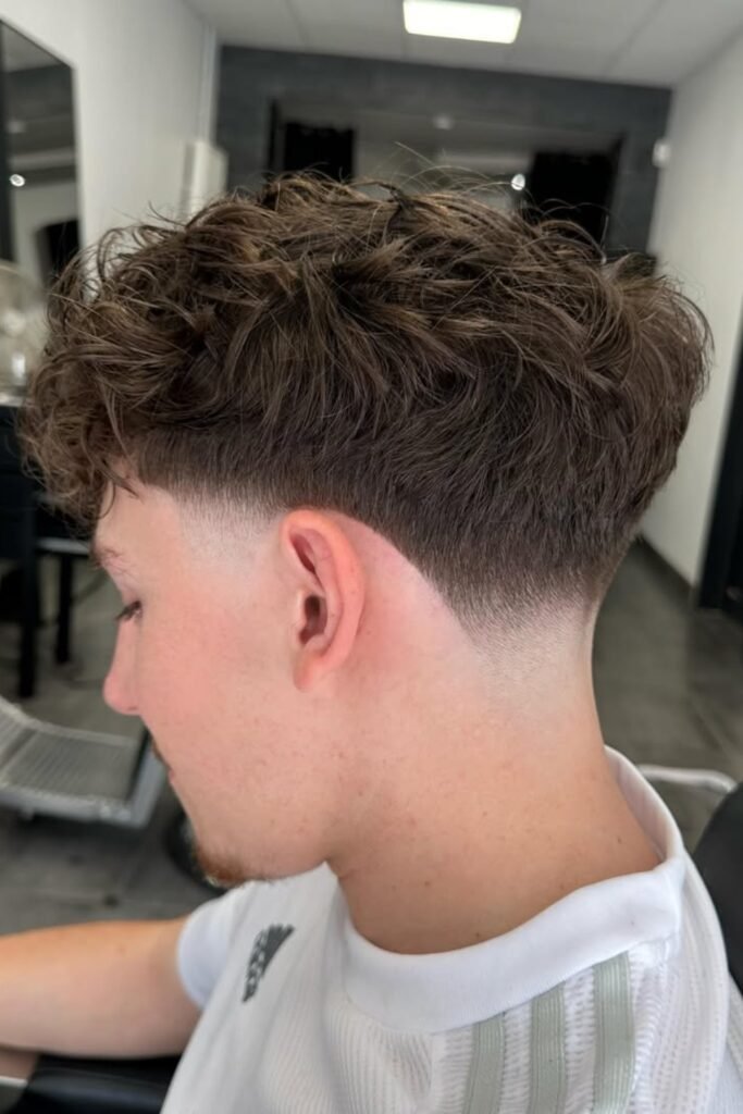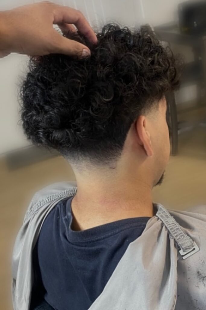 The mid taper tightens the neck and sides so the shape stays clean, while the curls on top stay full and textured.