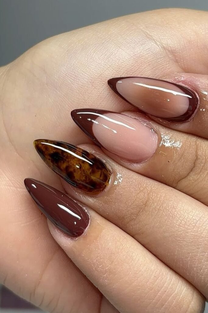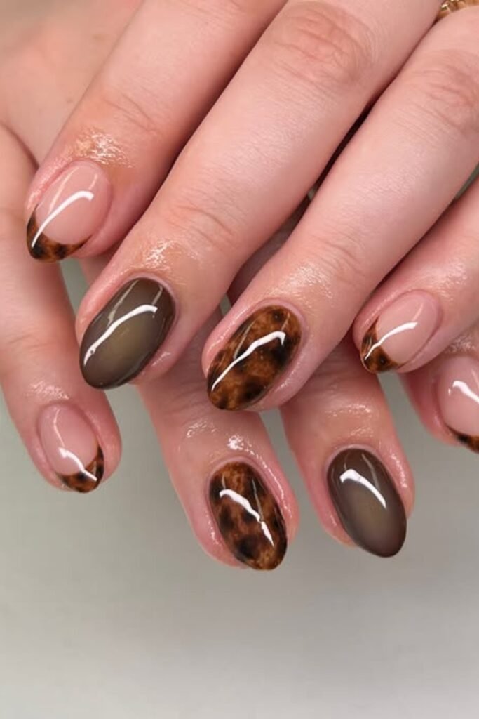 The mix of sheer mocha tips and full tortoiseshell nails works perfectly with fall outfits or gold jewelry.