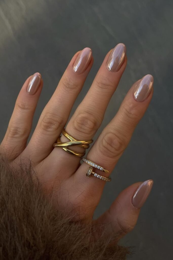 A light mocha base topped with a pearly glaze gives you a clean, reflective finish that fits perfectly with gold jewelry and neutral outfits.