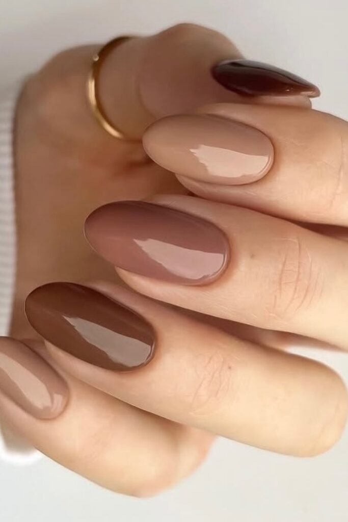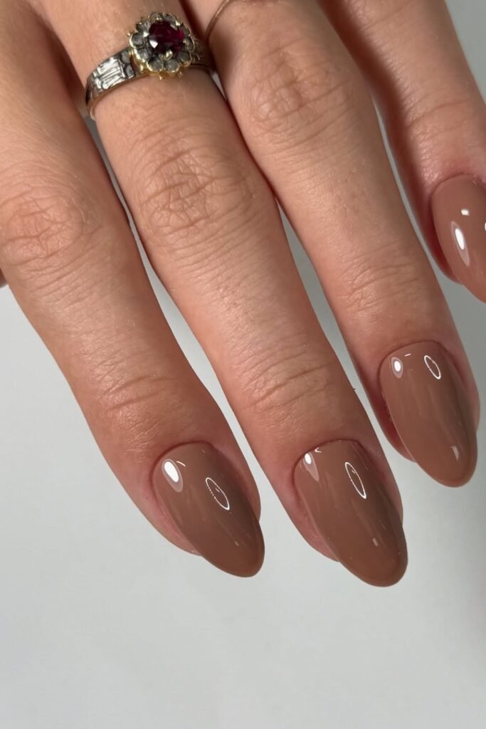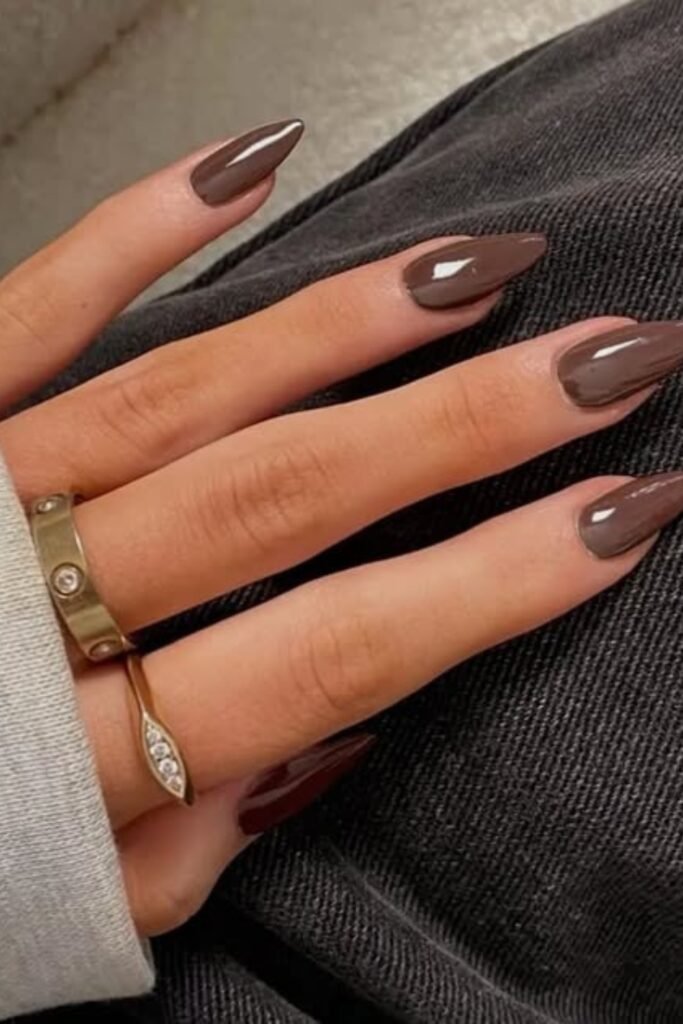 When you pair warm mocha polish with a clean almond shape, you get an easy everyday look that feels put-together.
