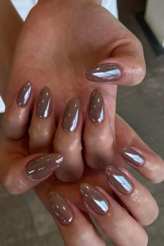 You can ask your nail tech for a solid mocha cream and a high-shine topcoat so it stays smooth and reflective even on shorter nails.