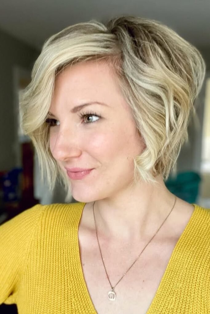 If you want a bright, low-maintenance cut, you should try a wavy blonde bob that softens your face and adds fullness.