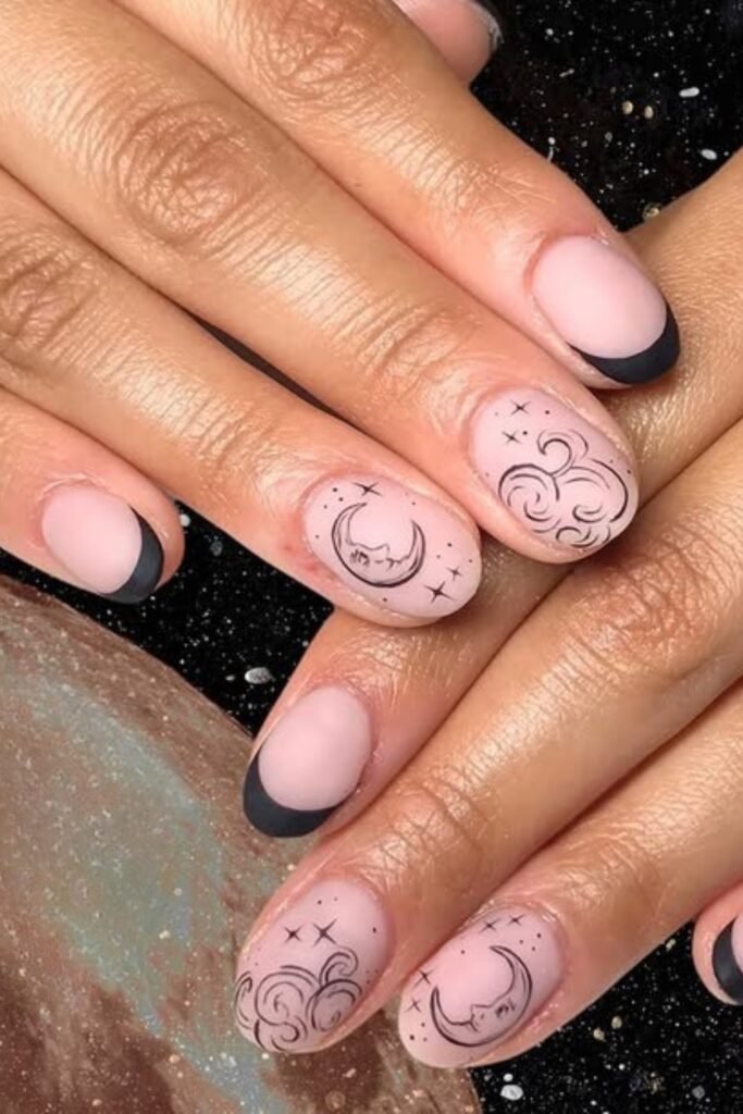 You keep things calm with a matte nude base, then let the black French tips and fine moon lines add that soft, witchy energy.