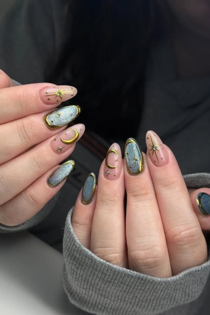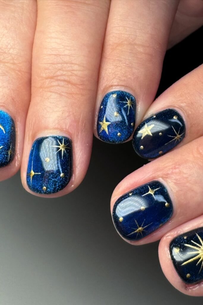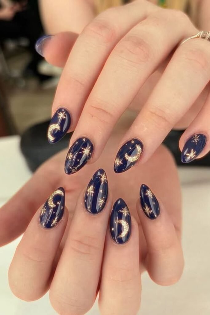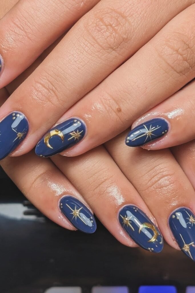 You get instant night-sky depth from the deep navy shimmer, while the gold stars and crescent moon keep each nail feeling intentional, not busy.