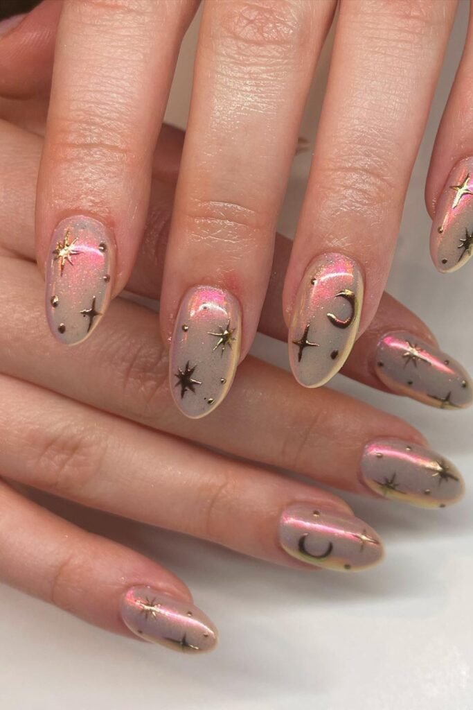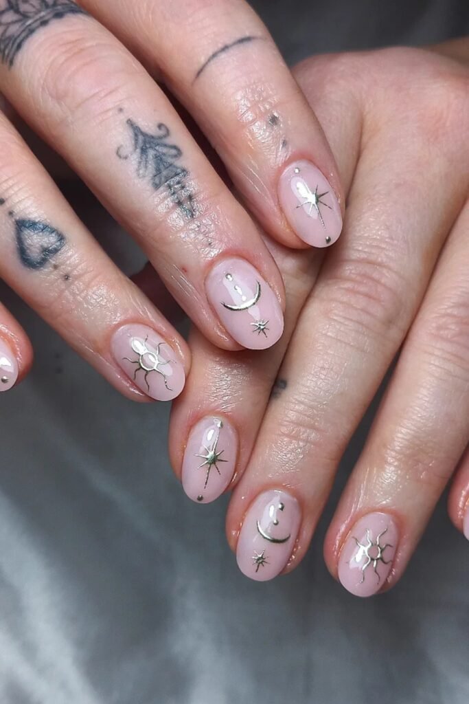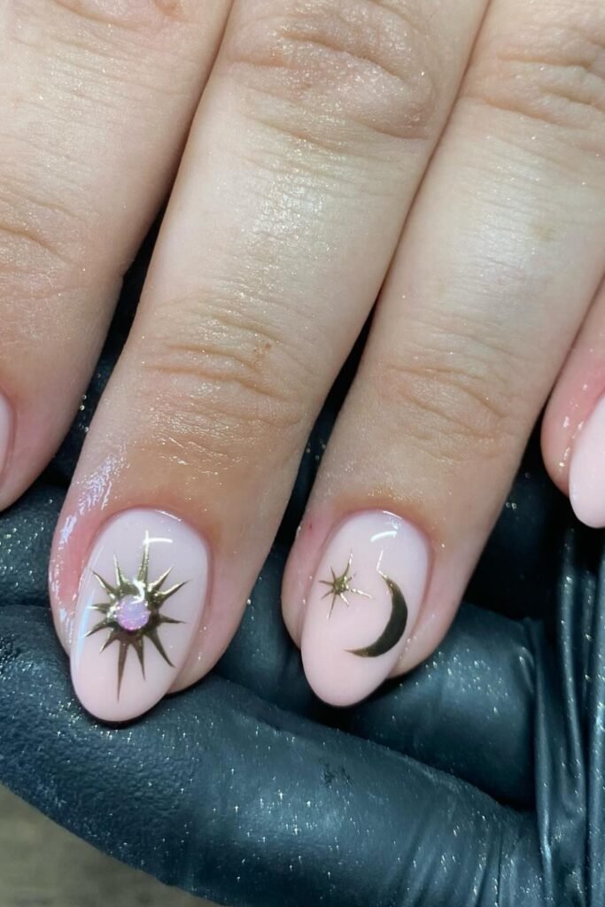 The sheer blush base almost disappears into the nail, which makes your tiny moons and stars feel intentional instead of decorative.