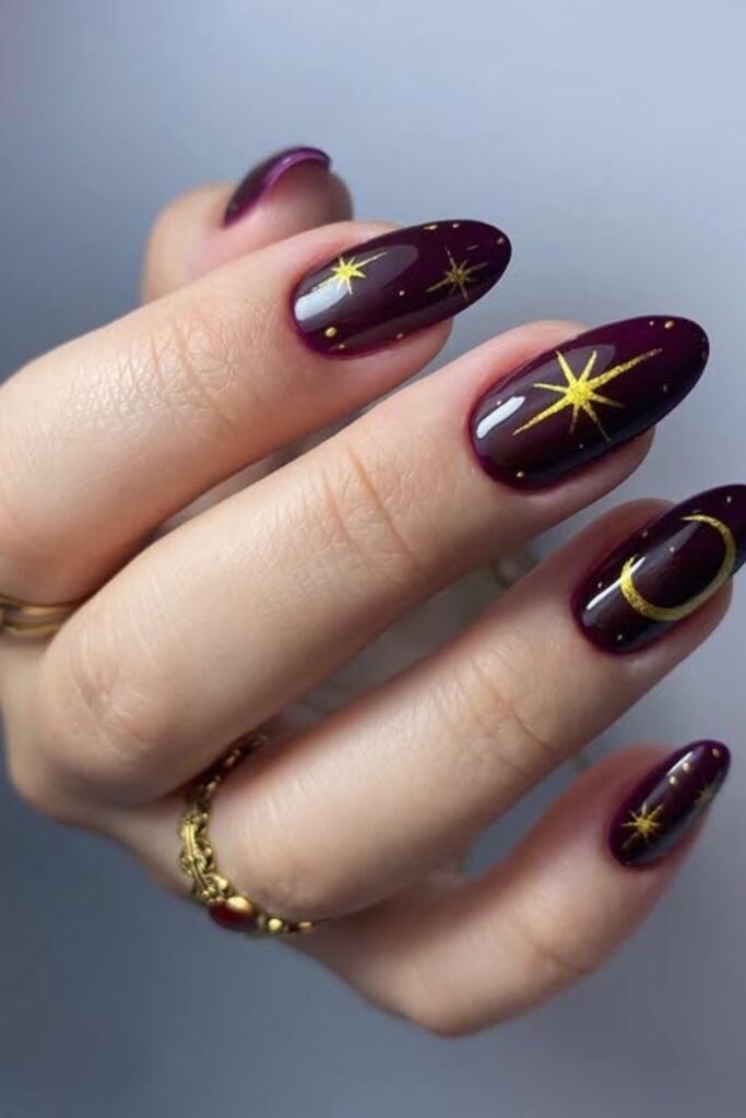 You get instant elegance from the deep burgundy base, while the gold moons and starbursts add quiet drama.