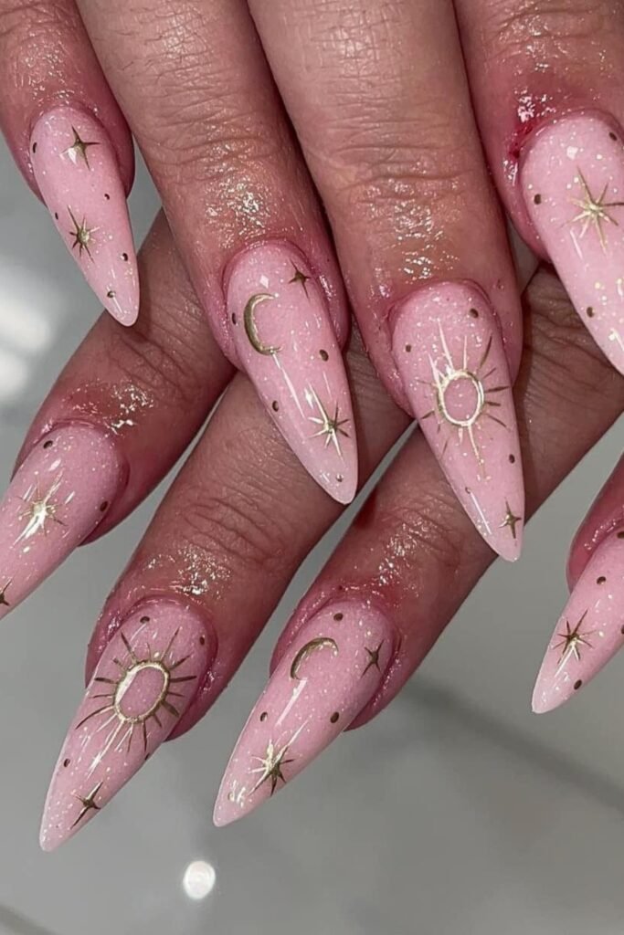 You get a pink, glitter-dusted base that keeps things romantic, while the gold suns and crescent moons stretch beautifully along the pointed shape.