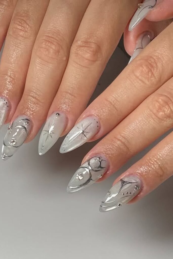 You can recreate it with a milky-grey ombré base, fine silver line work, and just a few gems.