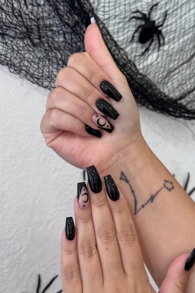 You can recreate it with jet-black gel, one sheer base nail, and a simple moon decal or fine-line art.