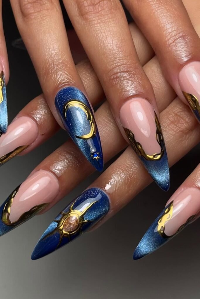 You get rich depth from the textured blue center, and the gold outline makes each nail feel polished instead of busy.