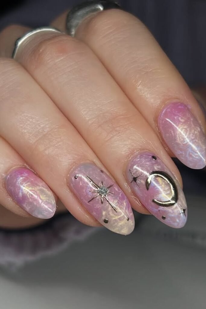 You will notice the milky pink base and white veining create that dreamy crystal effect, while the gold moon and star accents sit gently on top instead of stealing attention.