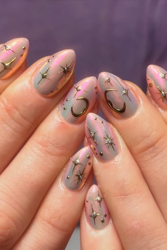 You can recreate it with a translucent neutral polish, a subtle chrome powder, and small, spaced-out celestial details.
