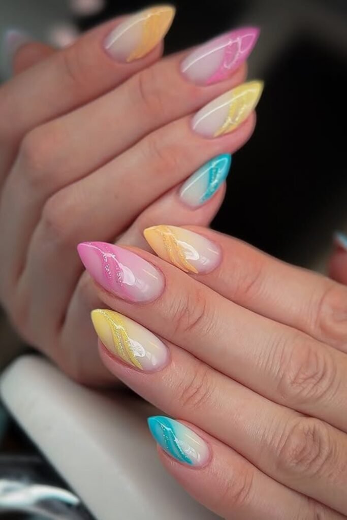 You can keep everything balanced with a sheer nude base, and let curved yellow, pink, orange, and aqua tips bring a playful twist that still feels elegant.