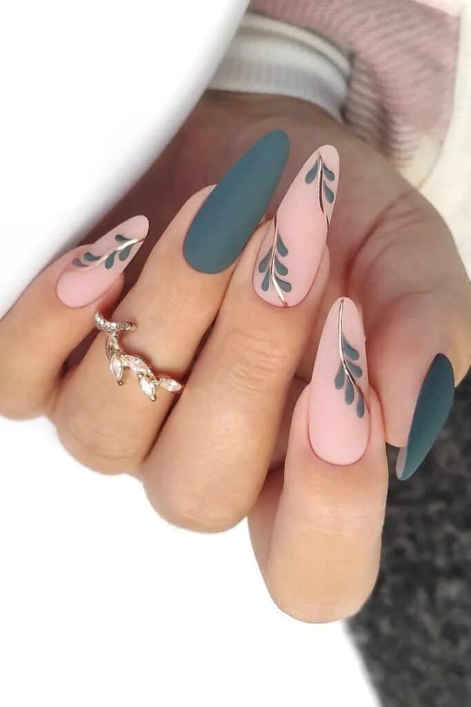 You can use a matte nude base, paint teal leaves with a thin brush, outline them in gold, and finish everything with a velvet matte top coat.