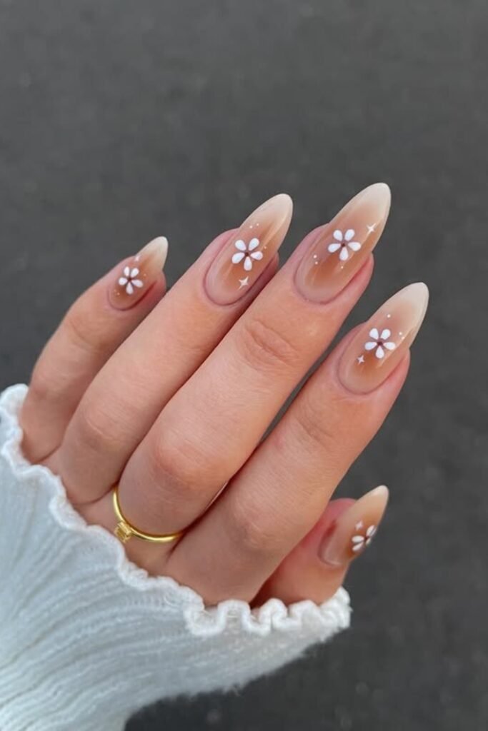 You can brighten a soft beige base with tiny white daisies so your nails feel playful and polished.