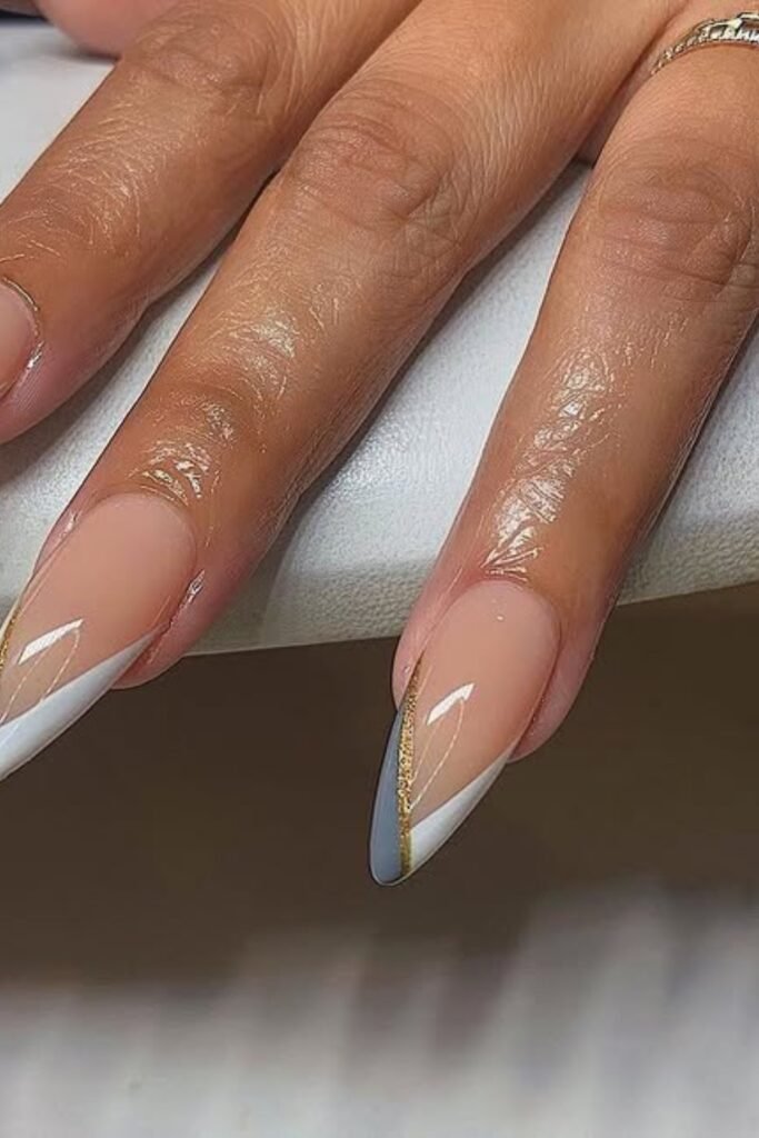 You should paint a sheer nude base first, then use nail tape for those diagonal tips, and add a thin gold striping line in the middle for that luxe contrast.