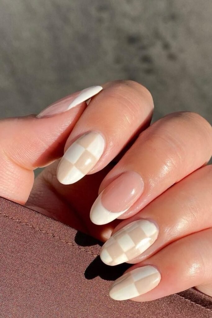 You get cozy texture with glossy beige nails when you add this chic plaid pattern.
