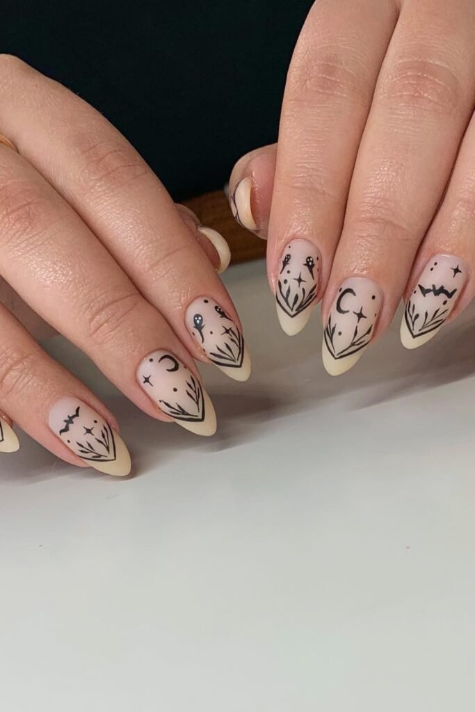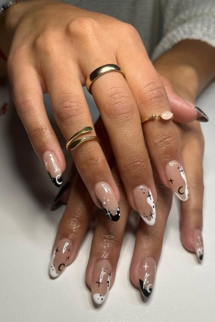 You can ask your nail artist for a milky nude base and hand-painted celestial symbols using gel liners for clean precision.
