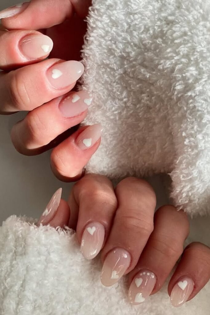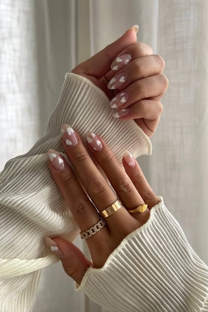You can scatter white hearts across a glossy nude base when you want something playful but romantic.