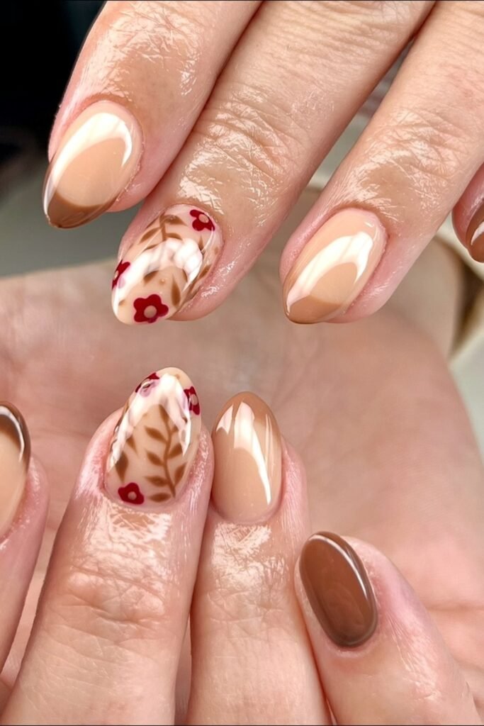 You bring the fall feeling to your hands with warm coffee tones and soft beige, and when you add tiny red florals, you get that playful autumn charm.