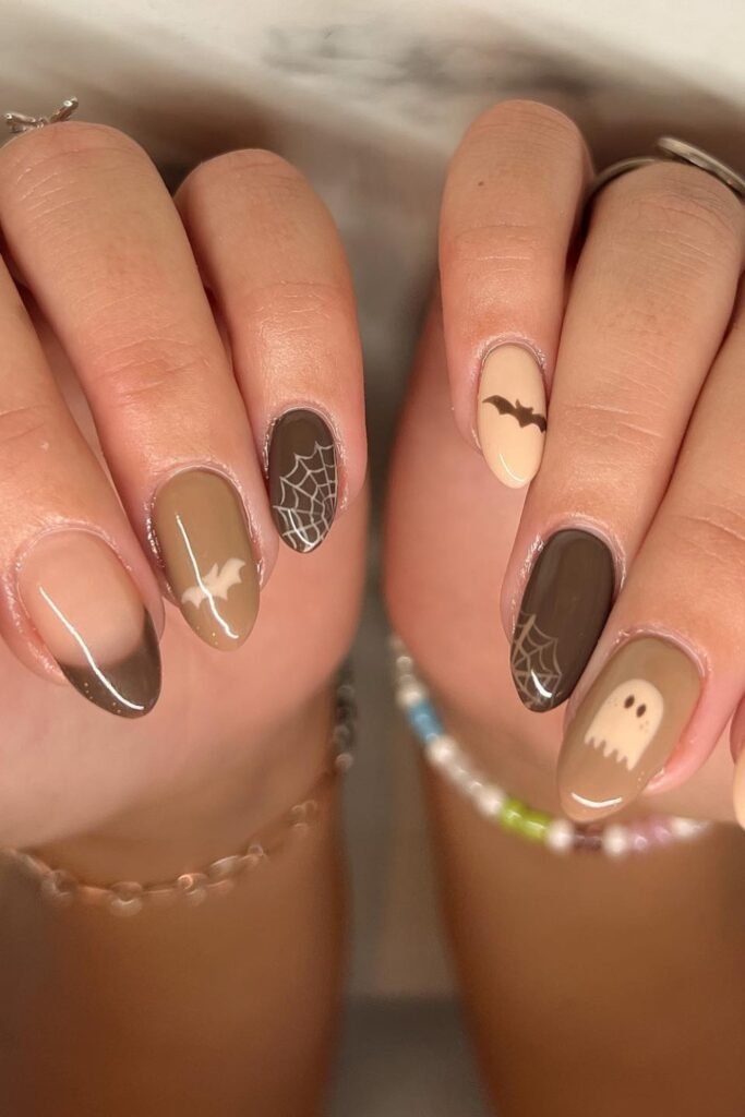 You can go for a mocha-beige palette that stays calm while tiny bats, ghosts, and webs add a playful twist.