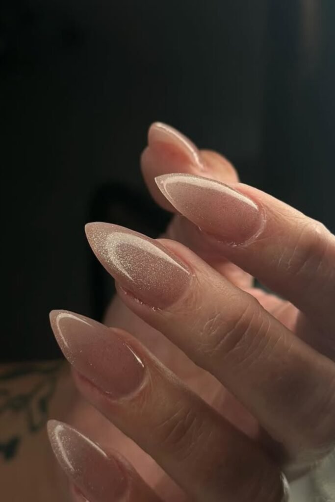 To get the same effect, you shape your nails into a soft almond and use a glossy top coat over a neutral base and you are done looking classy.