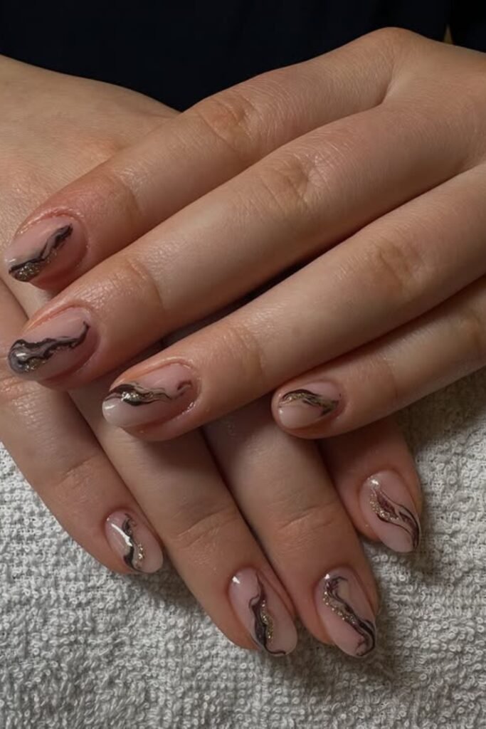 You can paint a sheer beige base, swirl fine black and bronze gel lines, and finish with a glossy clear top coat for depth.