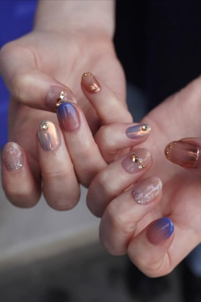 The tortoiseshell nails bring warm fall depth, while the soft blue chrome and gold celestial details keep things interesting.