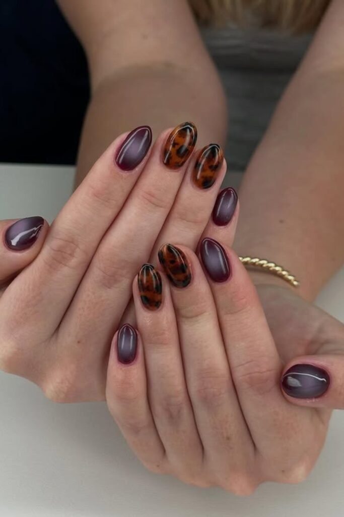 The deep burgundy gives you that cozy, moody base, while the tortoiseshell nails break things up so the set doesn’t feel flat.