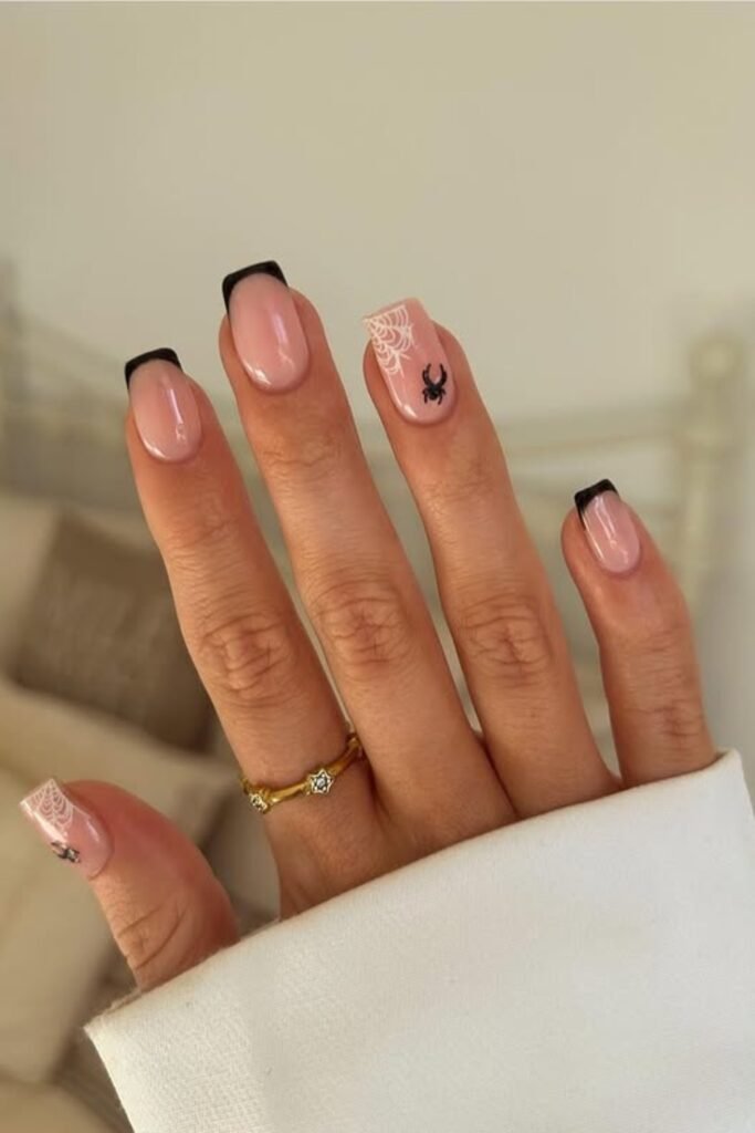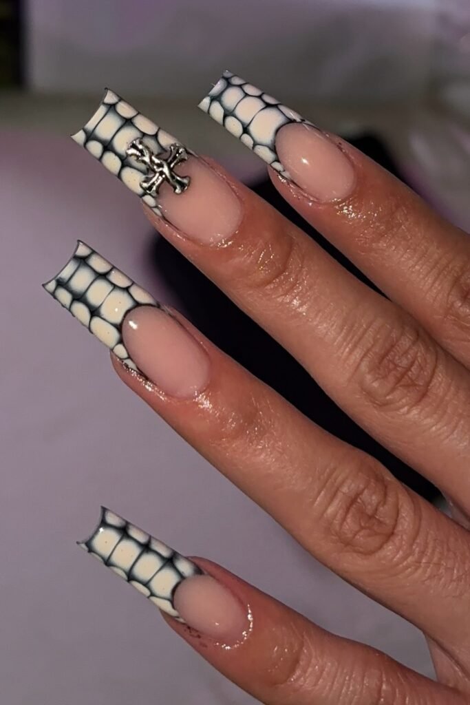 The webbed black-and-cream tips add a spooky touch, while the nude base keeps everything clean and structured.