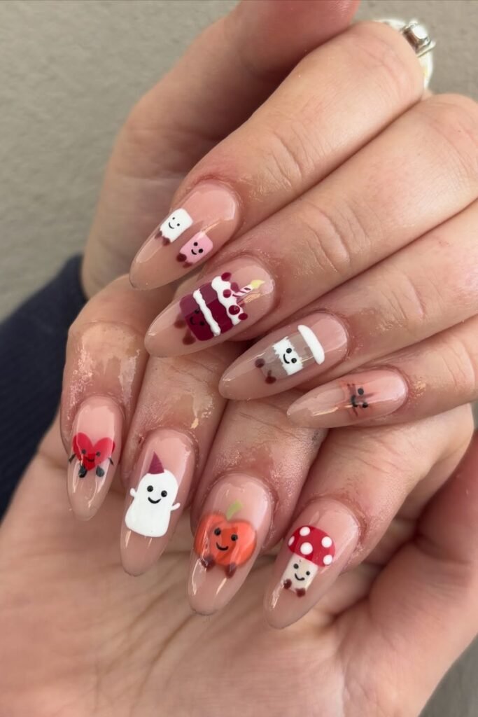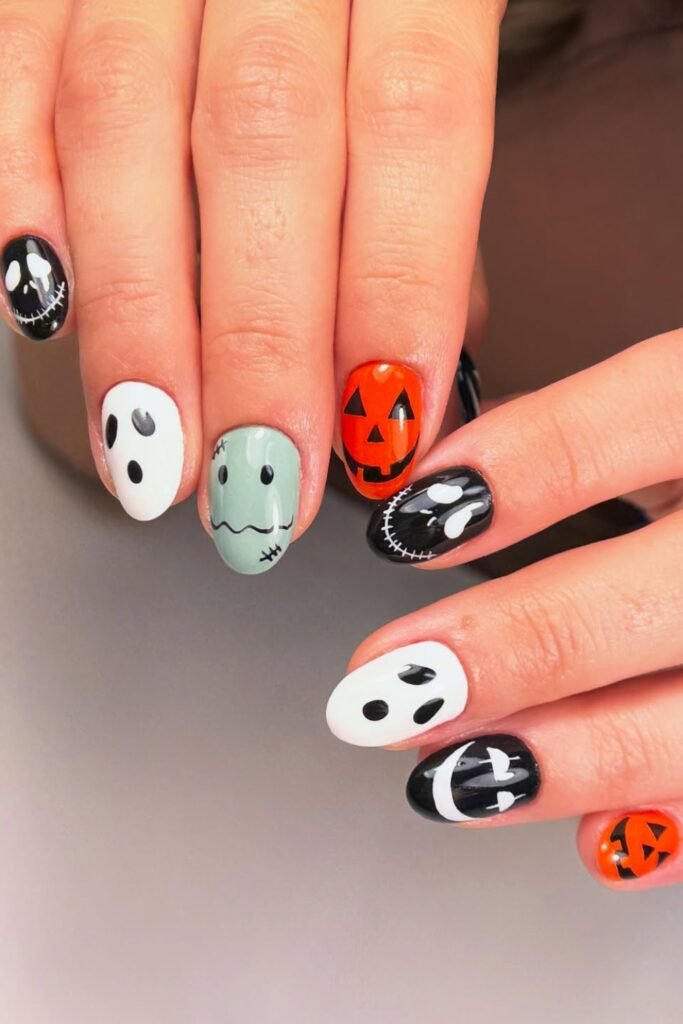 Each nail has its own little character, which keeps the whole look playful instead of scary.