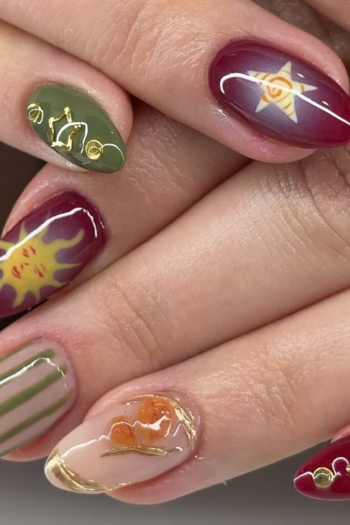 Deep burgundy, olive green, and soft nude bases give you a grounded fall palette, while suns, stars, stripes, and gold accents add personality.