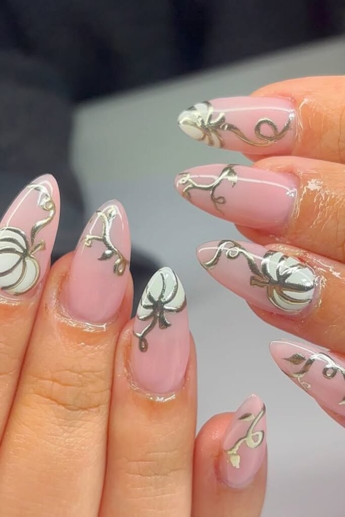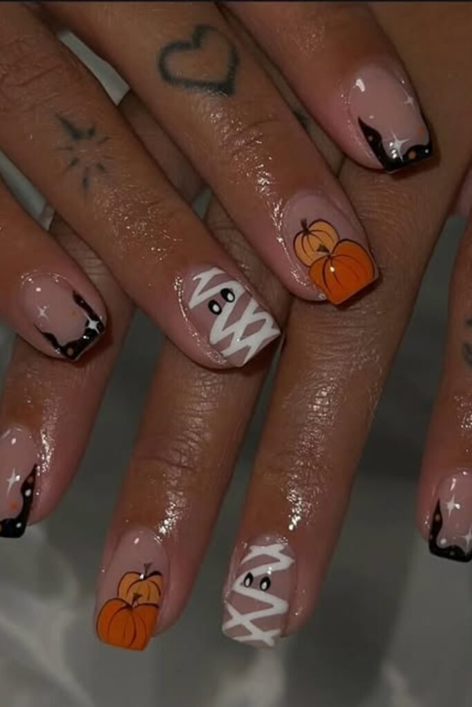 You will notice that the nude base keeps everything soft, while the small pumpkin and mummy details add just enough Halloween charm.