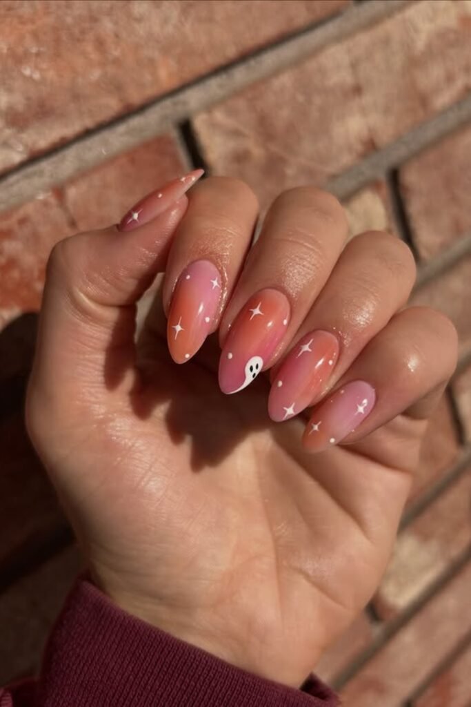 The sheer pink base helps everything stay soft, while tiny stars and a single ghost add just enough Halloween energy.