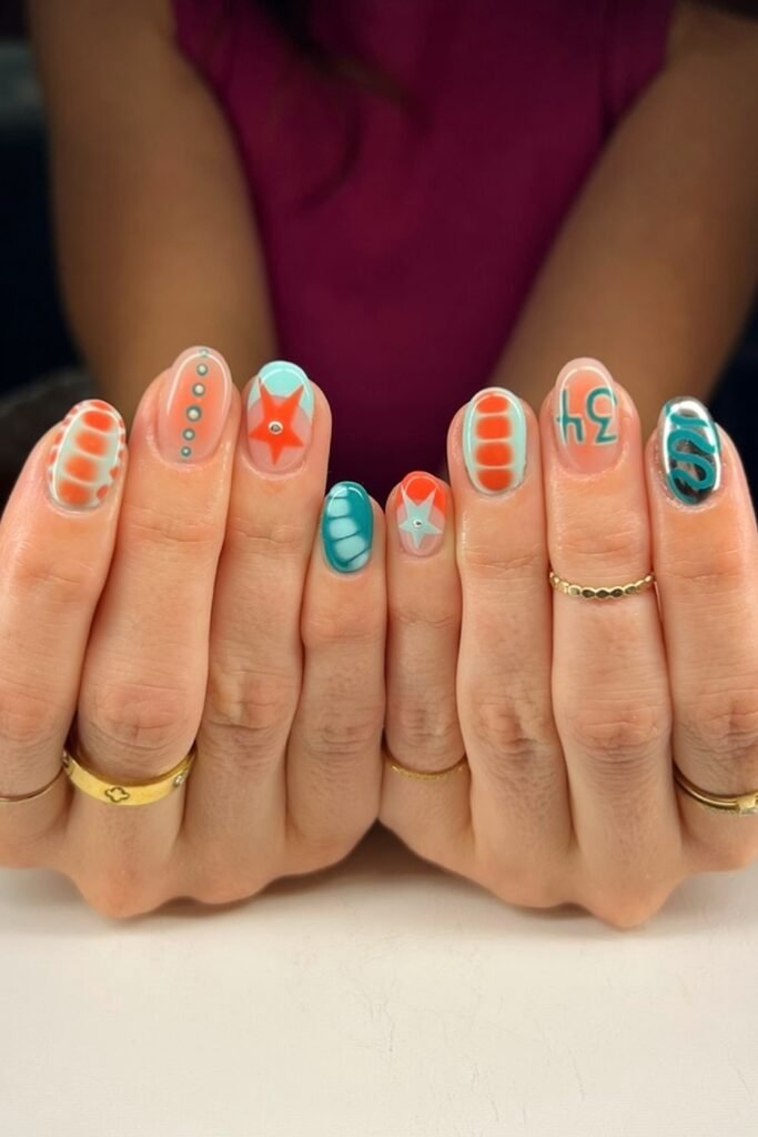 The teal and orange combination feels bold but still seasonal, while your graphic shapes give your nails a retro edge.