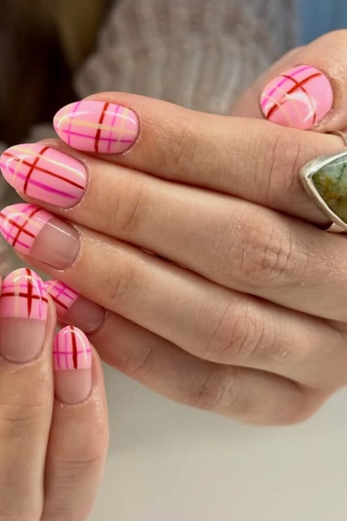 The pink base keeps everything soft, while the thin plaid lines add structure so the design doesn’t feel too sweet.