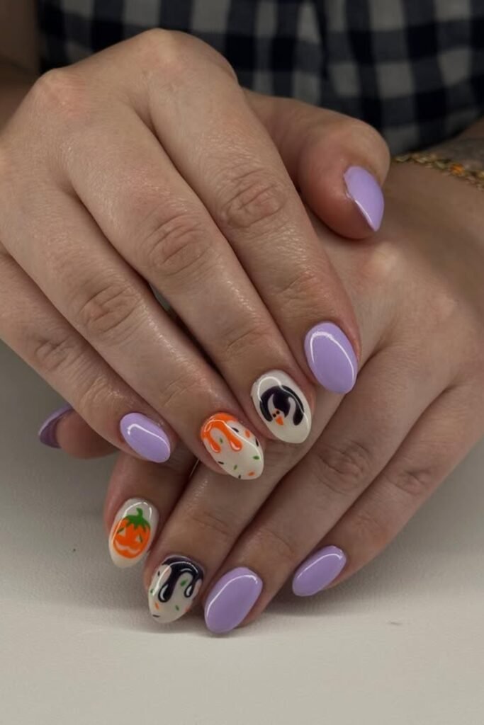 The soft purple keeps your nails fresh, while tiny pumpkin and ghost details bring in that Halloween touch.