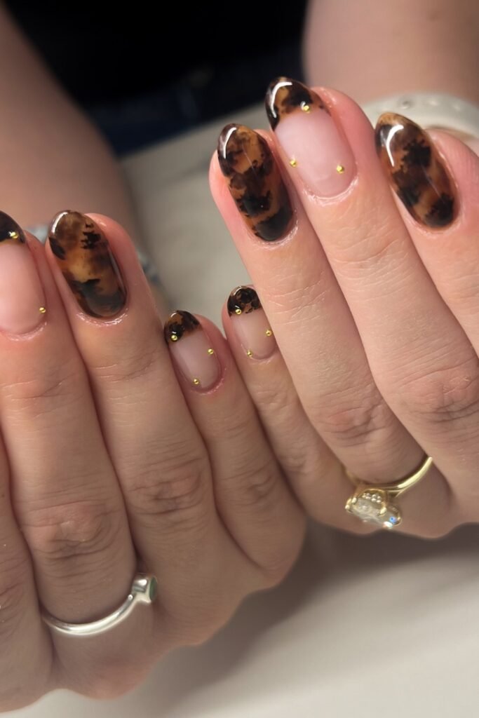 French tips instantly feel more fall-ready when you swap white for tortoiseshell, and you can see the difference right away.