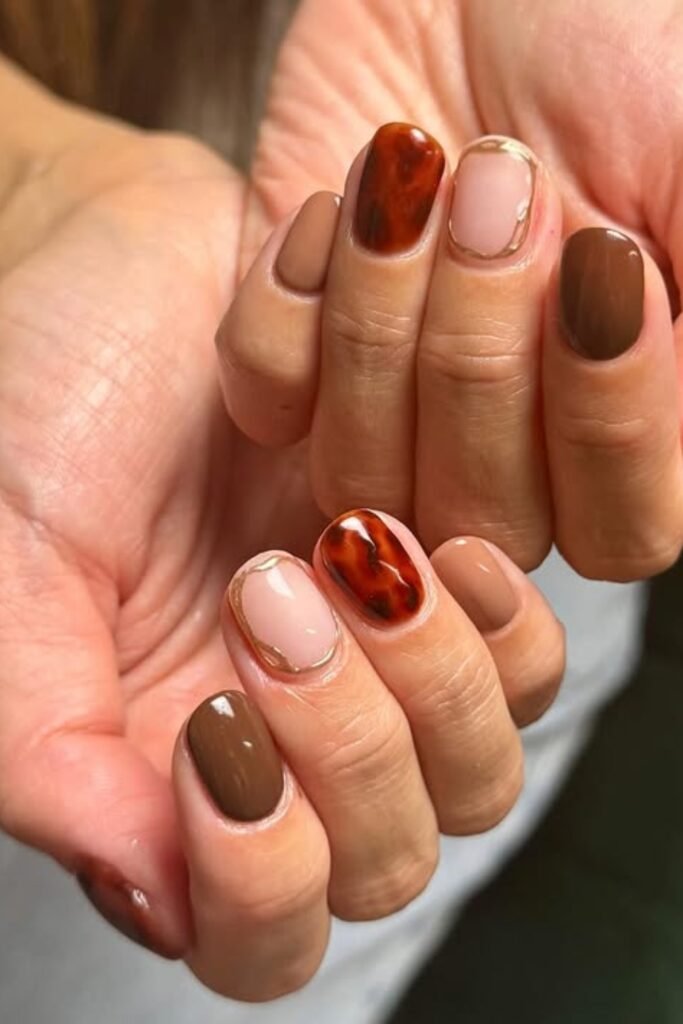 The mix of mocha brown, sheer nude, and tortoiseshell gives you a cozy, polished October feel without trying too hard.