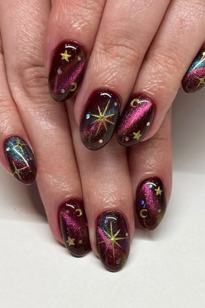 You can use a sheer burgundy shimmer base and keep the celestial details small so the color stays the main focus.