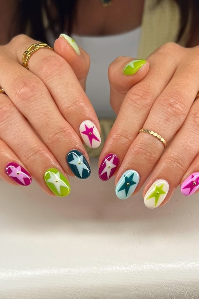 The bright star designs feel playful, but they work because you keep each nail clean and simple in shape.