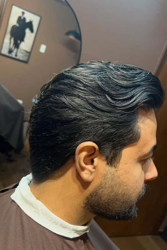 You need enough length on top to comb back cleanly and a clear disconnect on the sides. You can use a light pomade and keep the finish neat, not greasy.