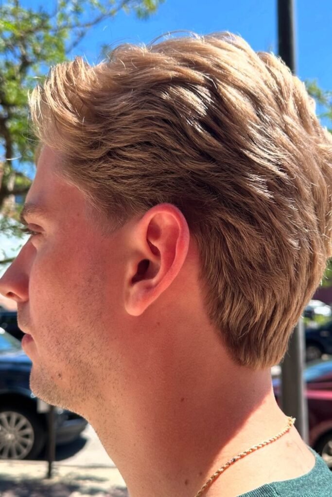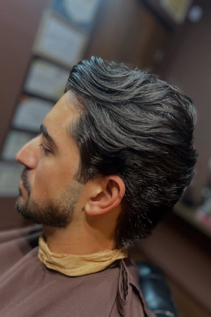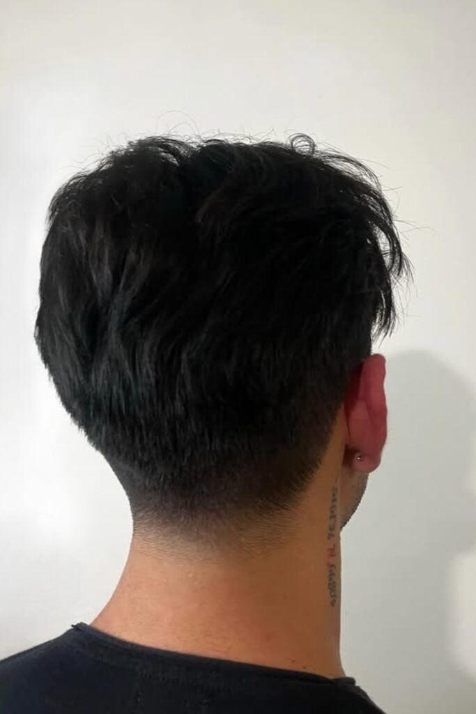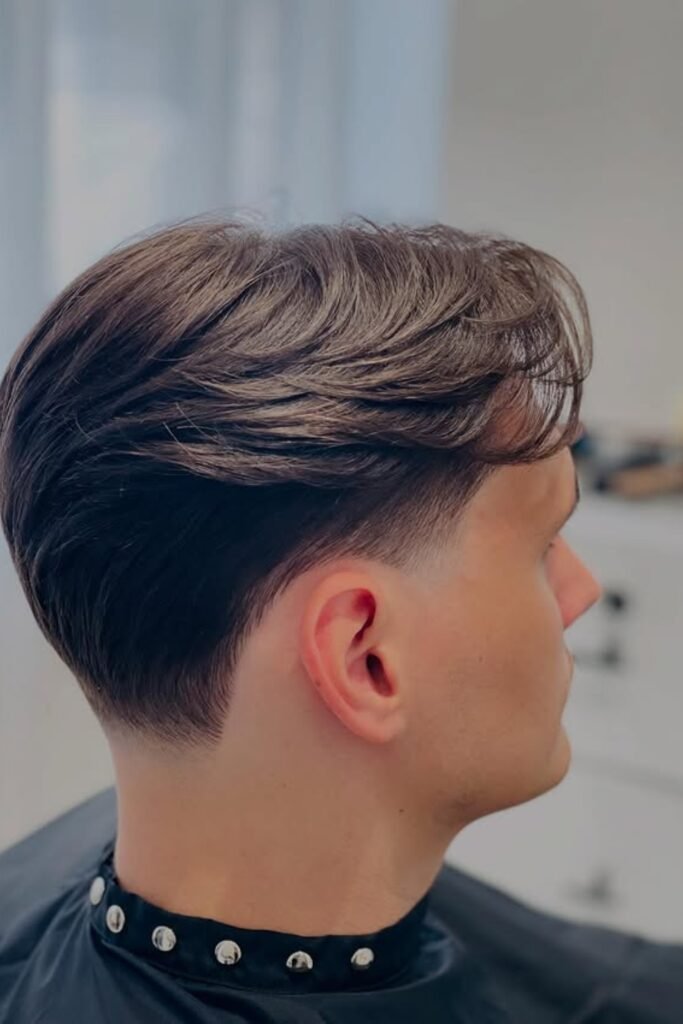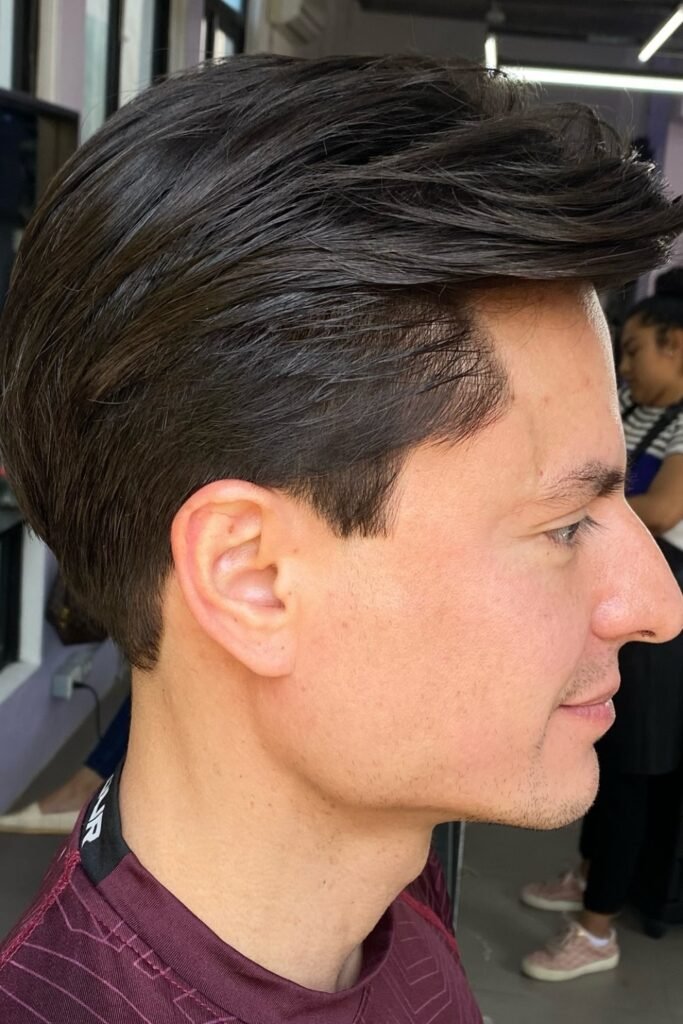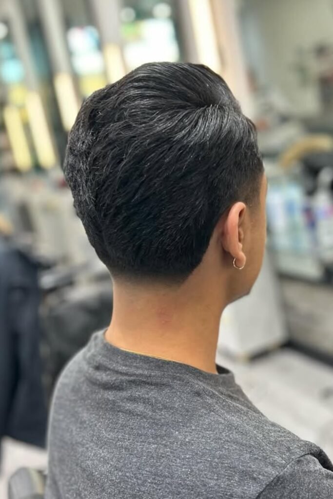The top stays fuller so the haircut doesn’t collapse from behind. This works best if you want a neat finish without losing volume.