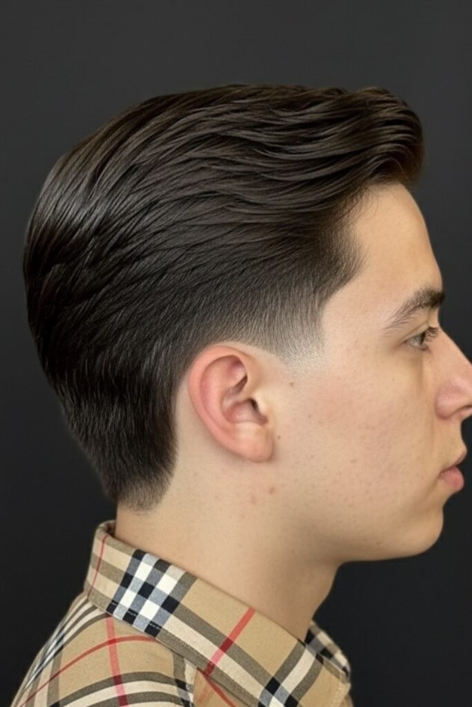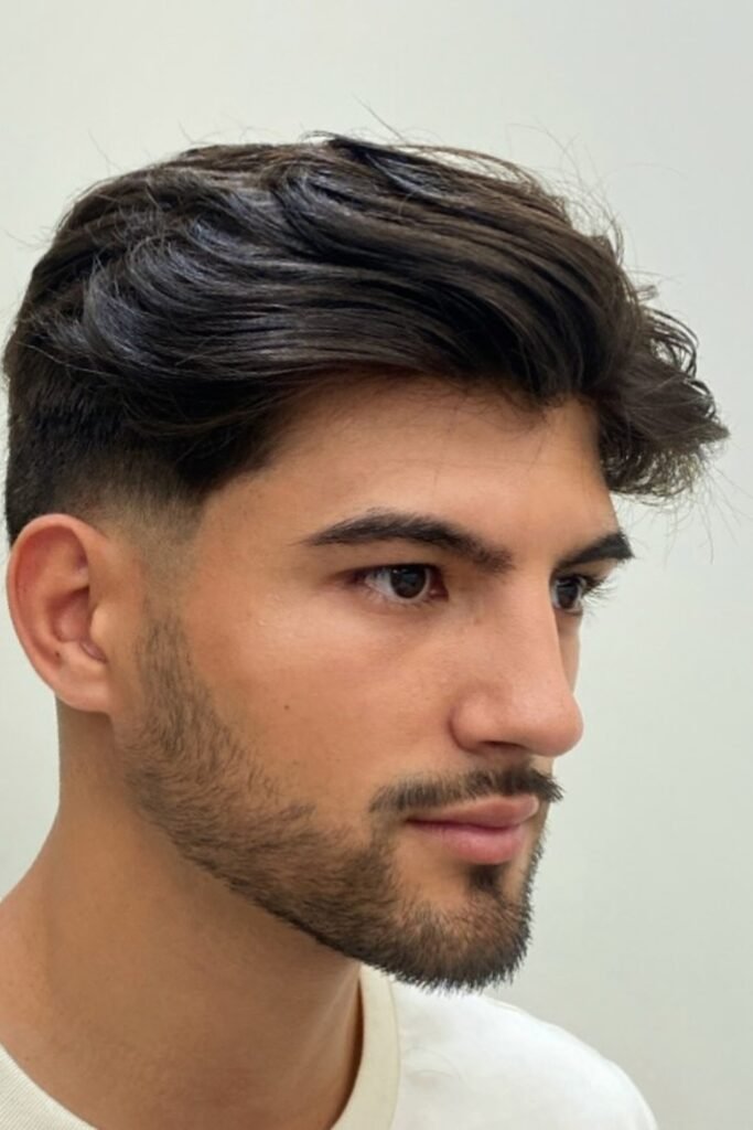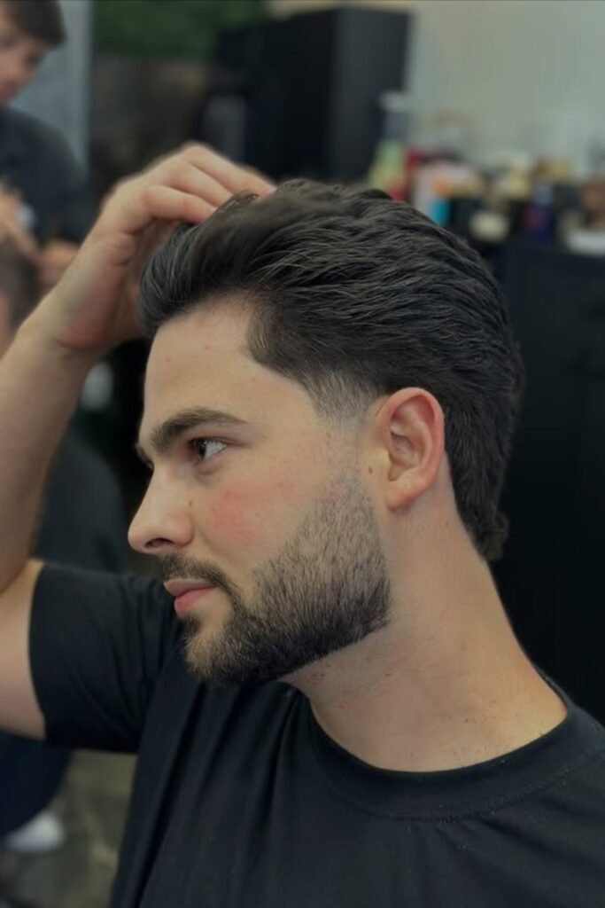 The sides are tapered clean but not faded, and the top is left long enough to comb back or slightly to the side.