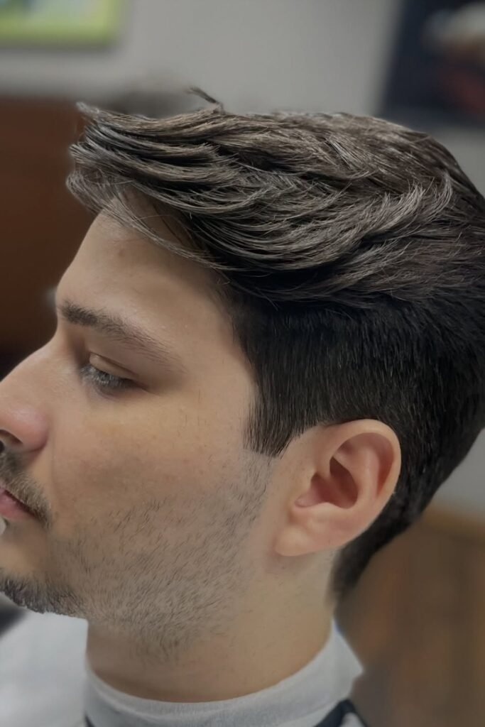You can cut the top with light texture so it naturally falls to the side, while the sides stay short and clean without harsh fades.