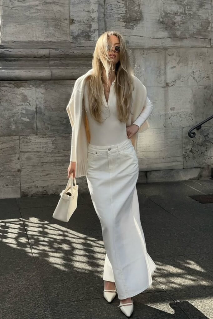 You can layer a cream maxi skirt with a soft knit top to look effortlessly elegant.