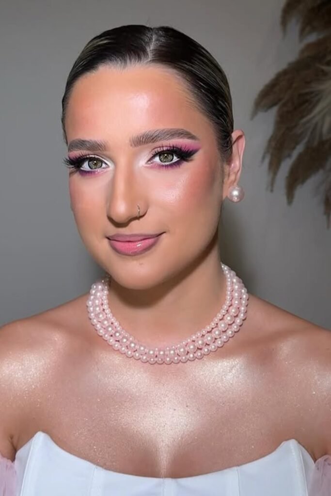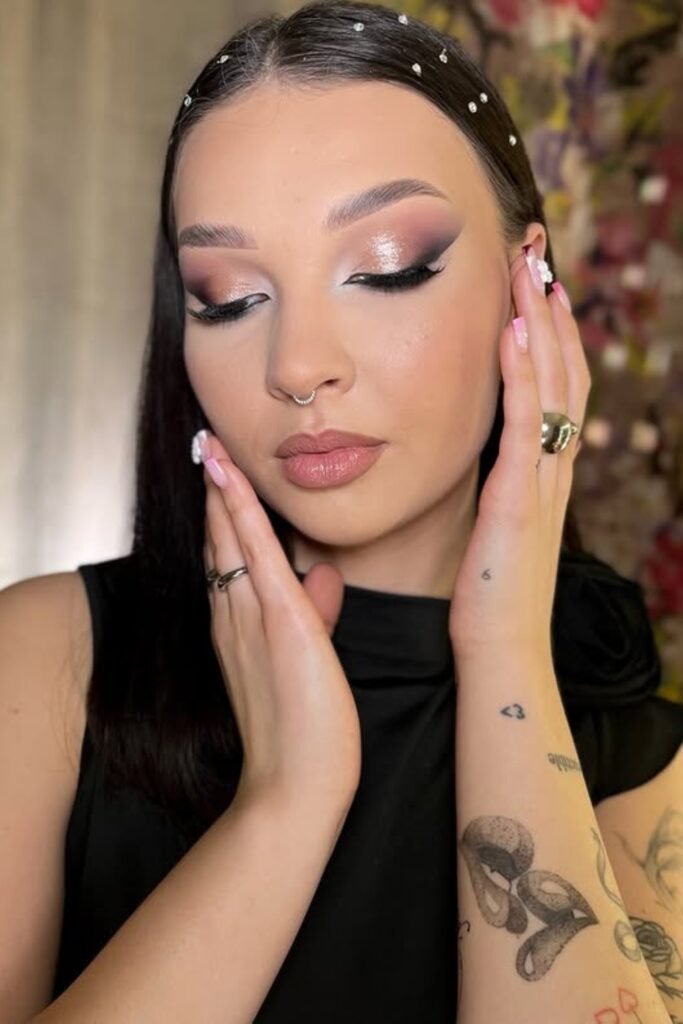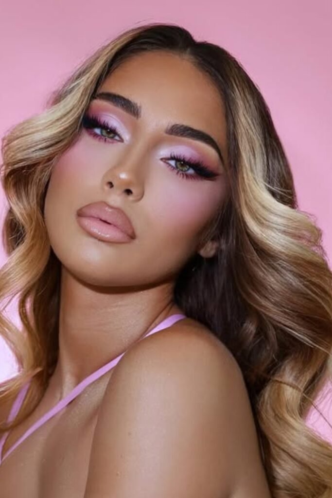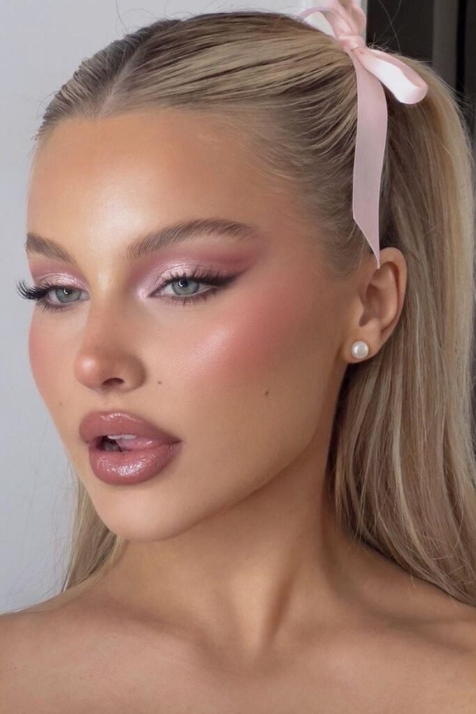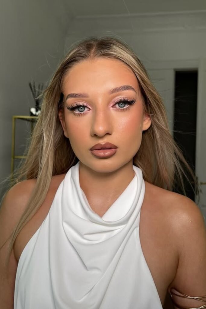 You sparkle softly, not over-the-top. Light pink shimmer hits your lids, bold lashes frame your eyes, and highlighter glows on the inner corners and cheekbones.