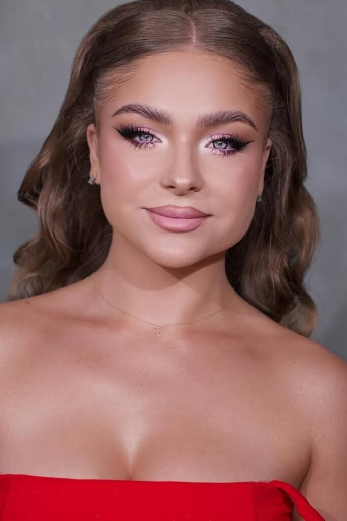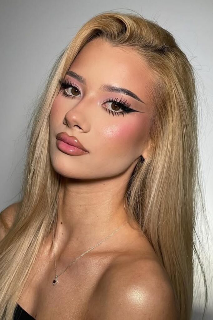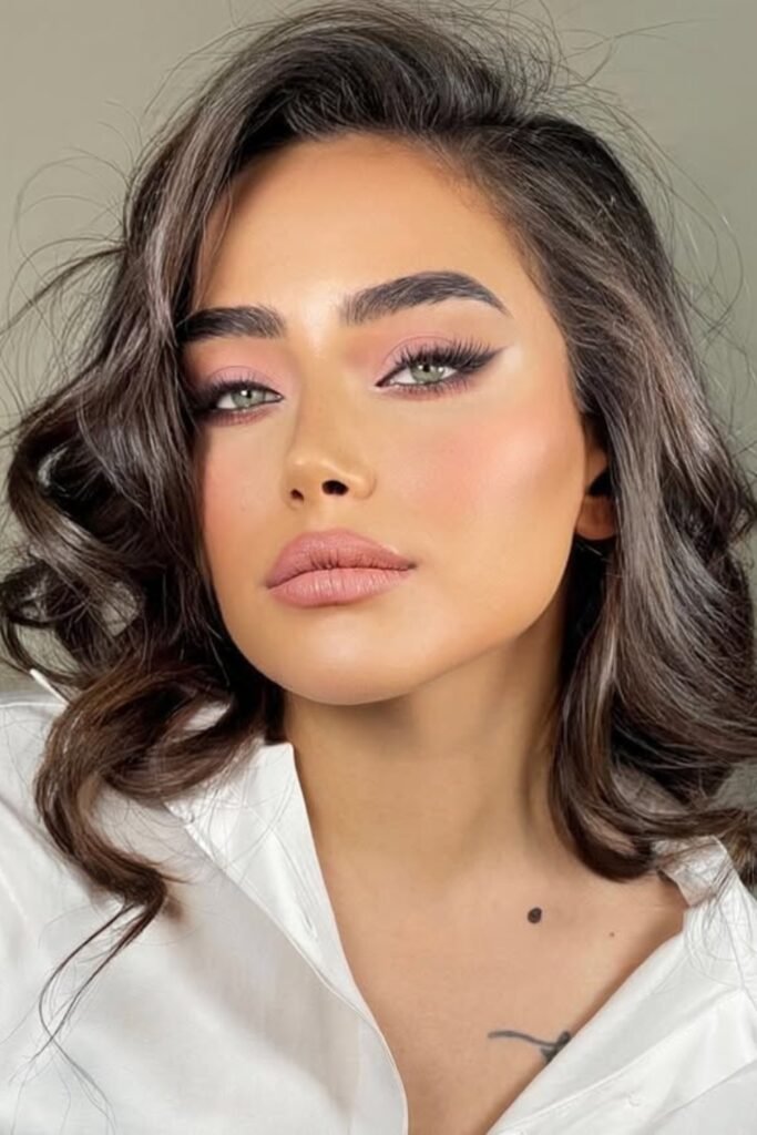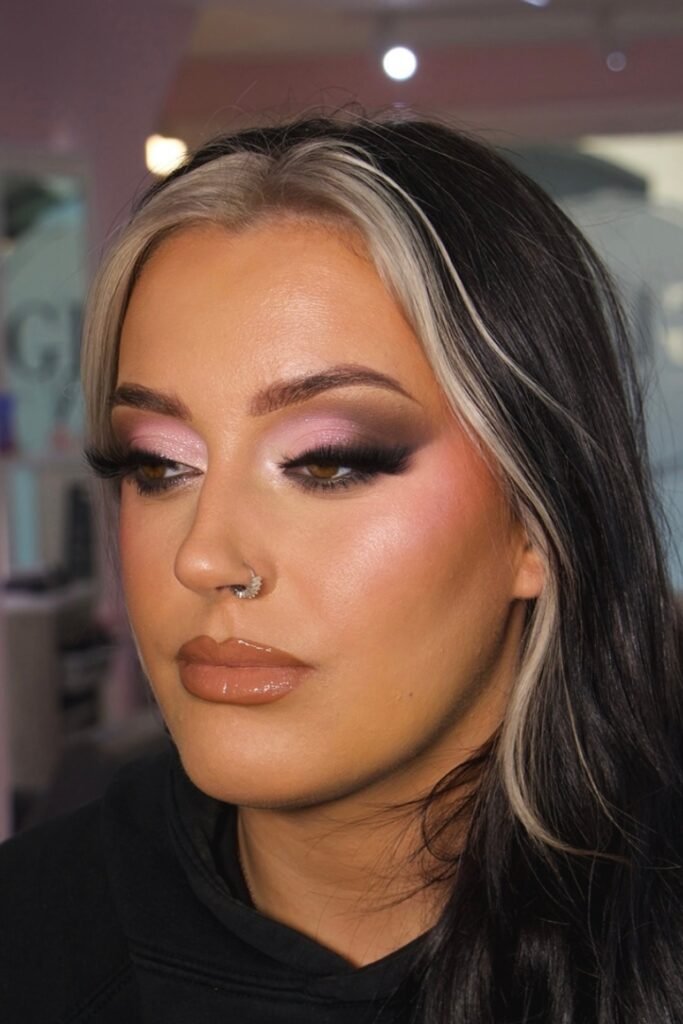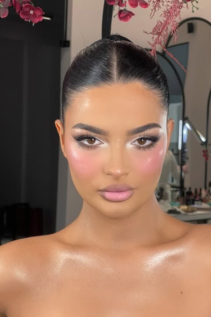 You sparkle softly, not over-the-top. Light pink shimmer hits your lids, bold lashes frame your eyes, and highlighter glows on the inner corners and cheekbones.