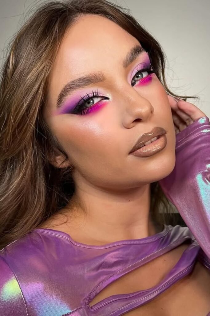You bring the drama with this one. That crisp white cut crease pops against bold fuchsia shadow, giving your eyes a sharp, playful edge.