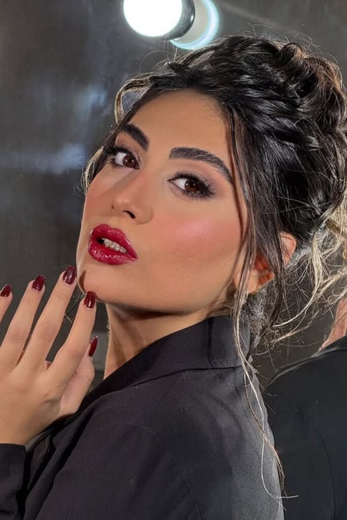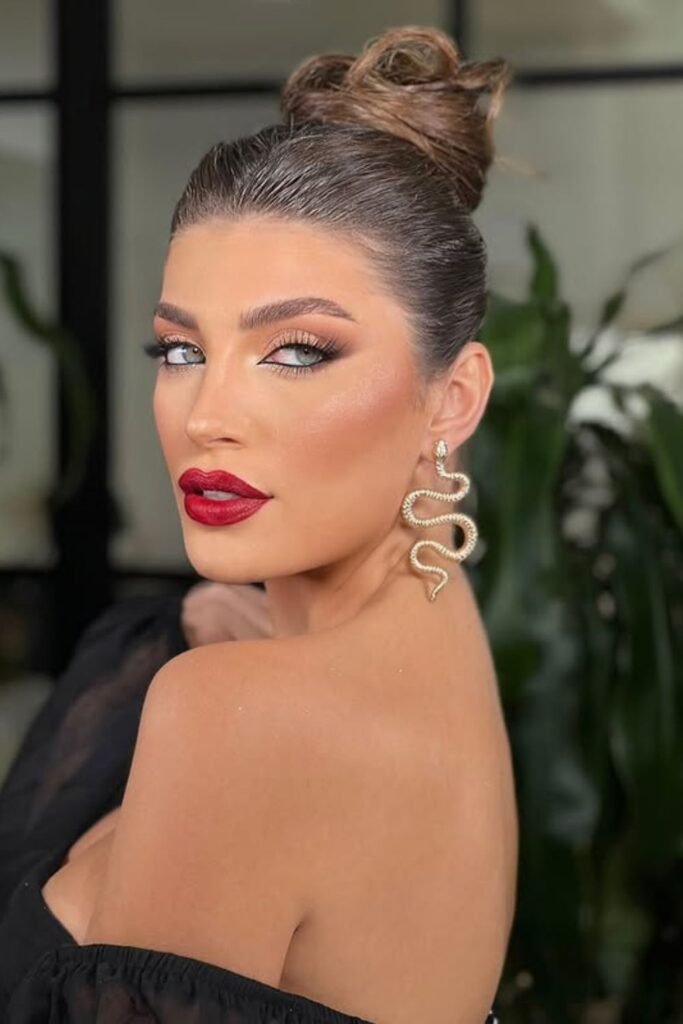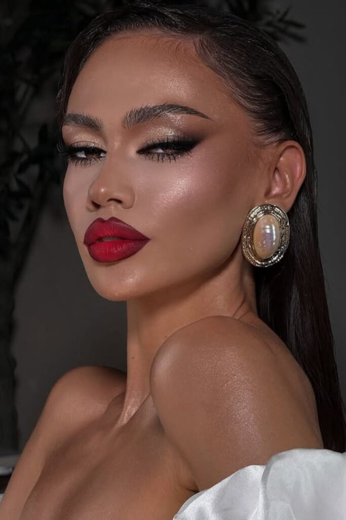 When you want a balanced, evening-ready look, soft glam eyes elevate a berry-toned red lip effortlessly.